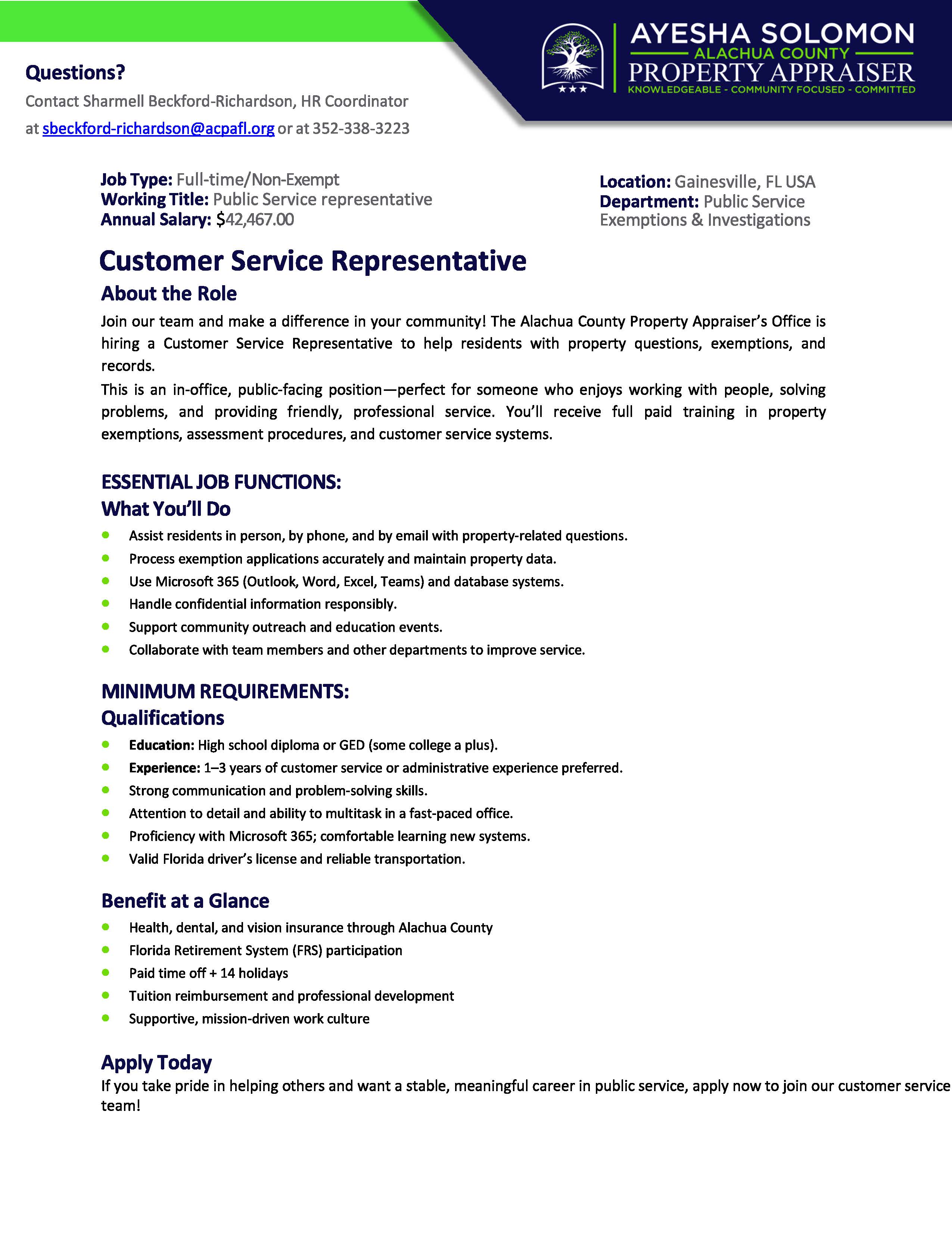 Alachua County is an Affirmative Action/Equal Opportunity employer. Alachua County gives preference in initial employment to eligible veterans and spouses of disabled veterans.