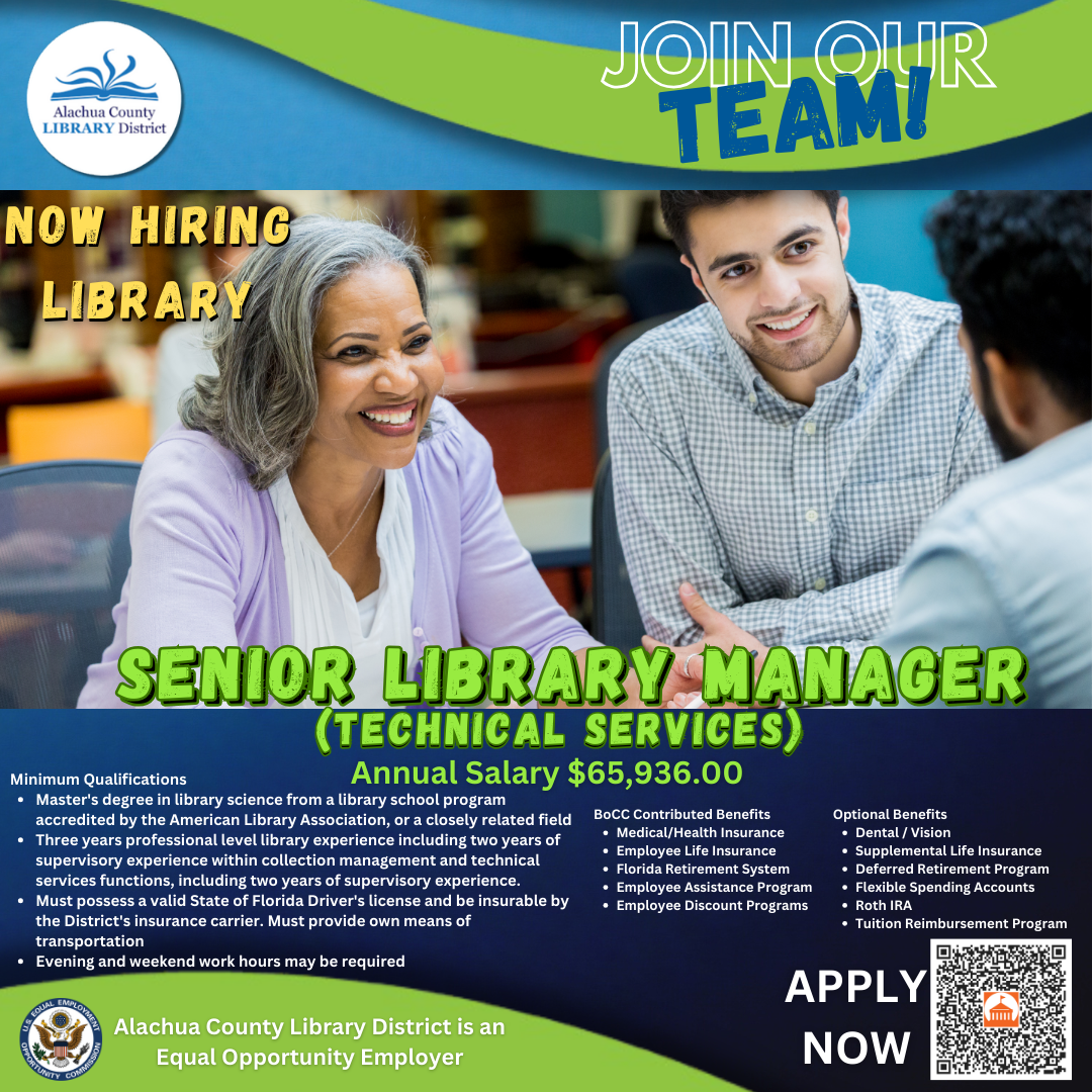 This is administrative, managerial, professional, and technical library work supervising and coordinating the activities within the Alachua County Library District.